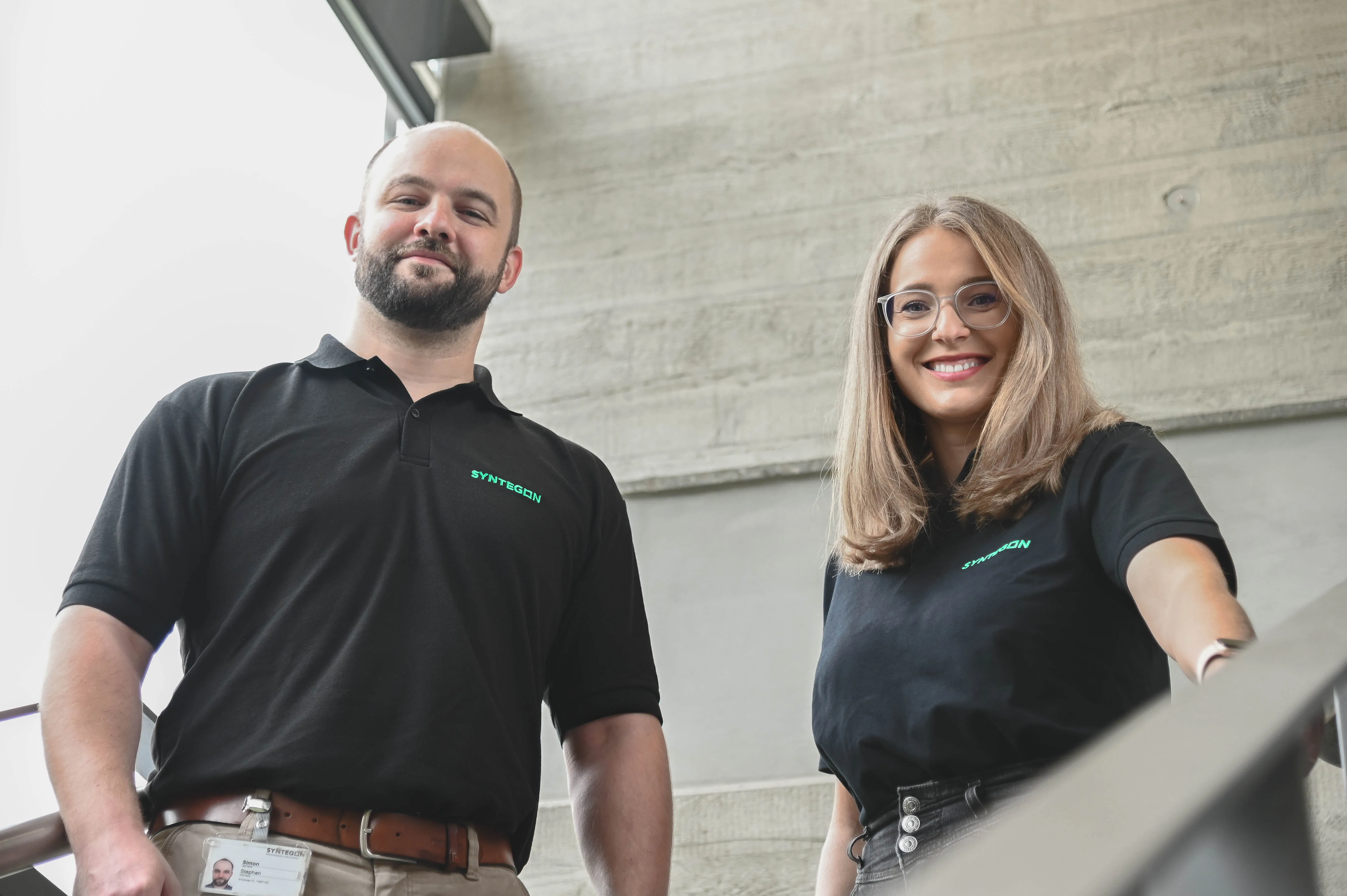 Zwei lächelnde Mitarbeiter von Syntegon Technology in schwarzen Polo-Shirts stehen auf einer Treppe.